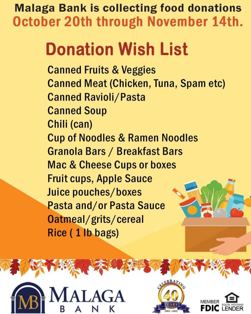 📍 Drop off donations at any Malaga Bank location or at the St. Francis church office.